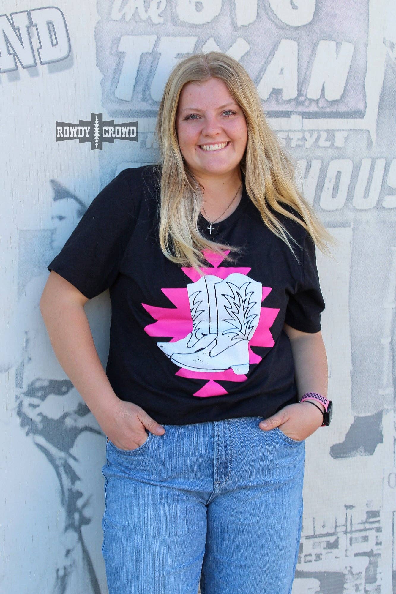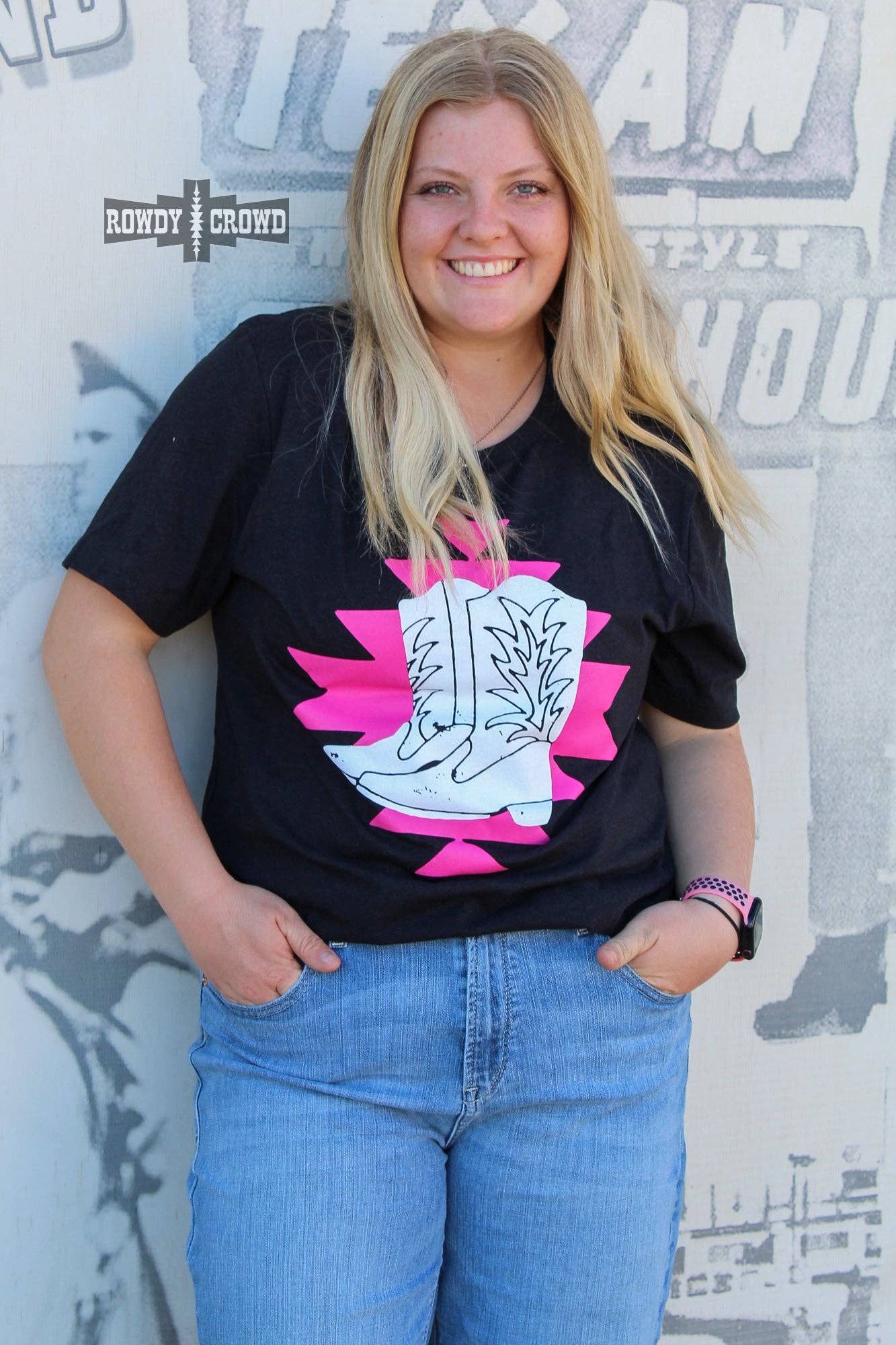 This Made For Walkin' Tee is perfect for fashion-forward trendsetters! Its black background is adorned with a pink aztec design, while a pair of crisp white boots stand boldly in the center. A must-have for any stylish wardrobe.