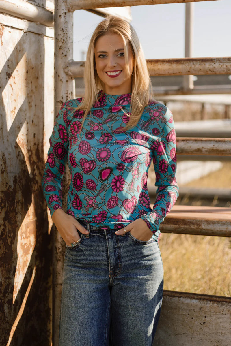 Turquoise dreams and concho hearts. The Navajo City Mesh is a vibrant celebration of Southwestern color. Featuring a stunning turquoise base adorned with intricate pink concho and heart-shaped gemstone motifs, this top is designed for the woman who isn't afraid to stand out. It’s the perfect blend of traditional Western iconography and a modern, playful palette.