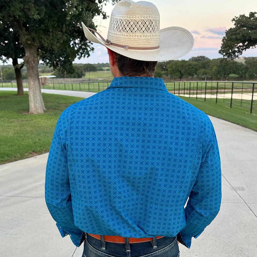 Bold Color. Unmatched Performance. The Highwayman is for the man who isn't afraid to stand out. Featuring a deep, vibrant teal geometric print, this shirt combines a striking, modern look with the elite technical specs that define our Signature Series.